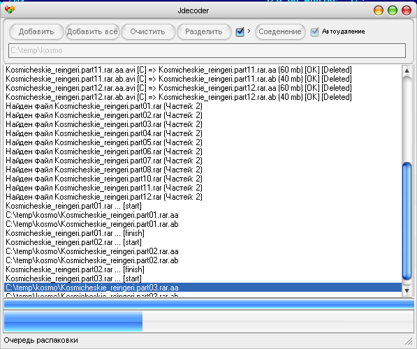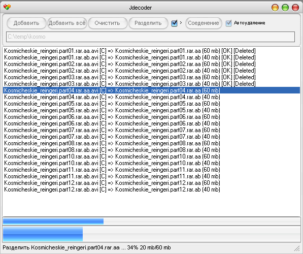 • Работать можно только в одной папке! если вы добавите файлы из разных папок то может они и расшифруются(не уверен), но уж точно не склеятся...